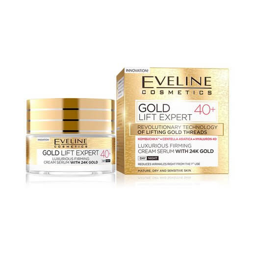 Eveline αντιρυτιδική κρέμα προσώπου 50 ml Gold Lift 40+. Η εμφύτευση χρυσών νημάτων είναι μια επαναστατική φόρμουλα σε κλινικές αισθητικής ιατρικής. Αποτελεί εναλλακτική λύση ενάντια στις επεμβατικές μεθόδους. Τα νήματα διεγείρουν την παραγωγή κολλαγόνου και ελαστίνης. Αποτέλεσμα, να δημιουργείτε ένα πυκνό δίκτυο νέων ινών στήριξης γύρω από κάθε ένα από αυτά.